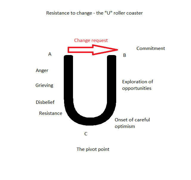 It’s that simple: You are here at “A” and you “only” need to go to “B” and voila, you are done. The concept may be simple, but it isn’t that easy though. We are humans. What most people do not consider is that change happens in a “U” shaped curve through a pivotal point “C” (as per the illustration, click on it to enlarge it).