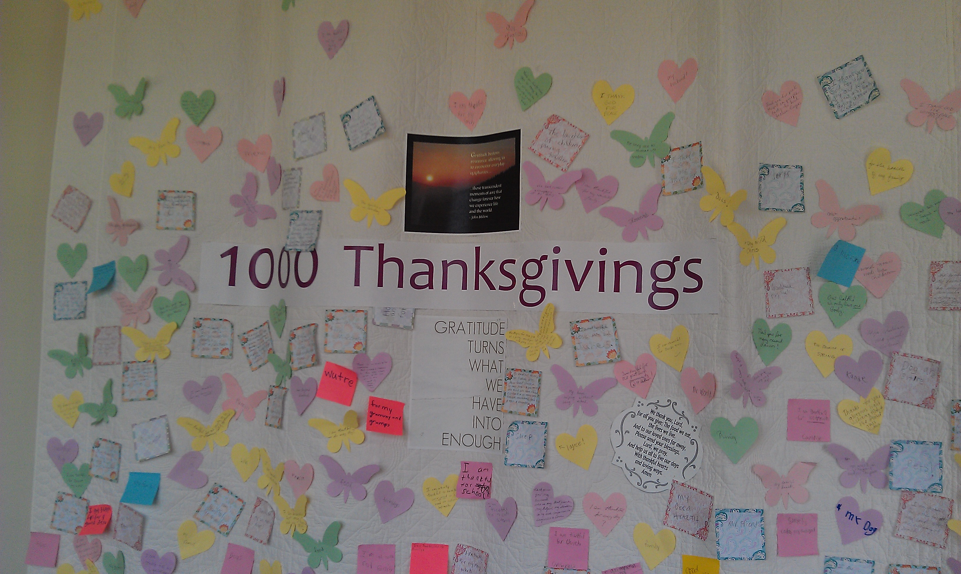 In the attached photo you can see the “1000 Thanksgivings” project at our local church. Everyone was to ponder what he / she is grateful for, write it down, and share it on the wall. On one hand you will really be taken aback by having to slow down your brain long enough to put your own ideas down. As you place your sticky note on the wall you notice all the other entries. In my particular case the things other people put down took my breath away, because face it, there are plenty of disasters and messes out there. You automatically feel better and most of all grateful for the “little” mess you may be blessed with.
