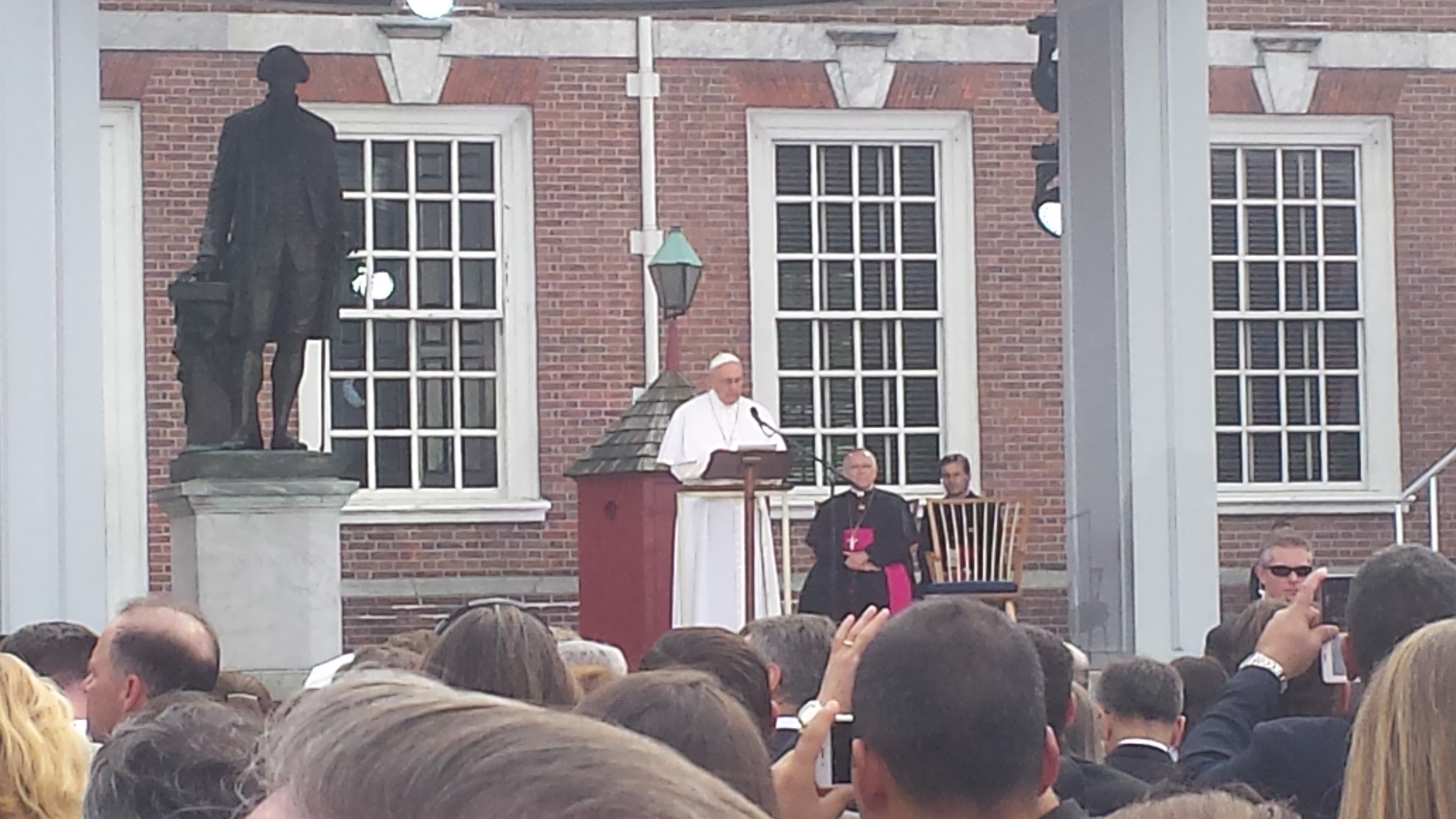 After various speeches of public officials Pope Francis arrived with his motorcade. The spectators lining the streets went wild. He was led through Independence Hall and took his place in front of the lectern President Lincoln used in his Gettysburg address. His speech, which he held in Spanish, was truly historic. I really liked how he repeatedly emphasized that we have to include and love everyone worldwide. He also asserted that we represent “spheres” and how we have to guarantee that everyone can be a true human individual. Wow! To me, he provided another small sign that he his a truly unique and refreshing Pope came when he quoted a key sentence from the Declaration of Independence: “…that all men and women are created equal..”. Wow, he had included women.